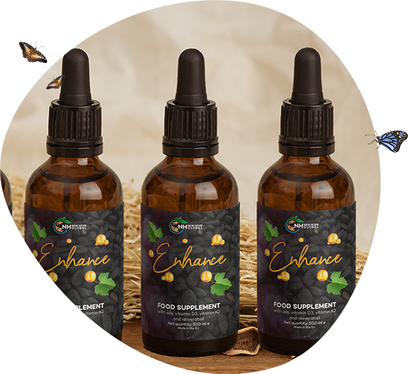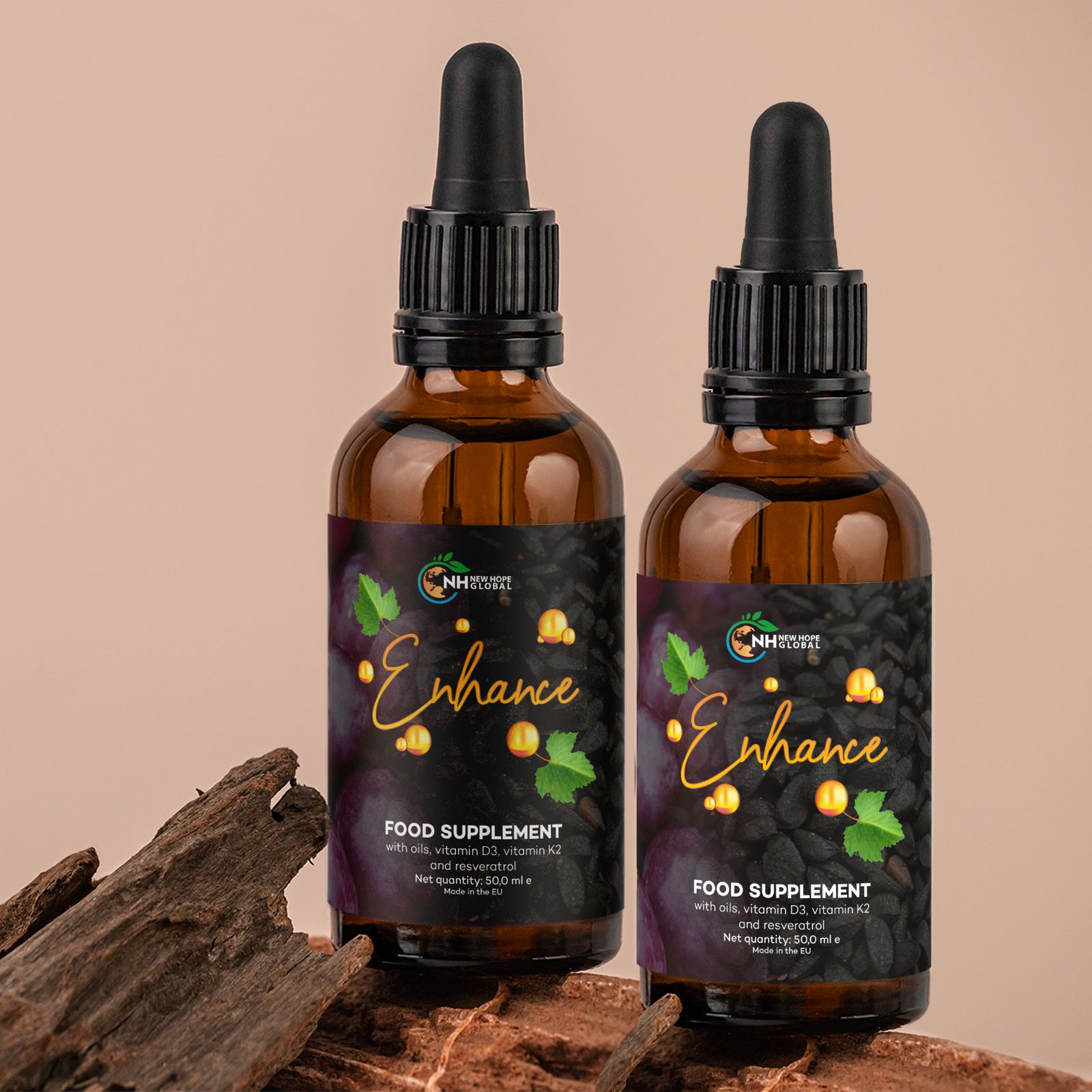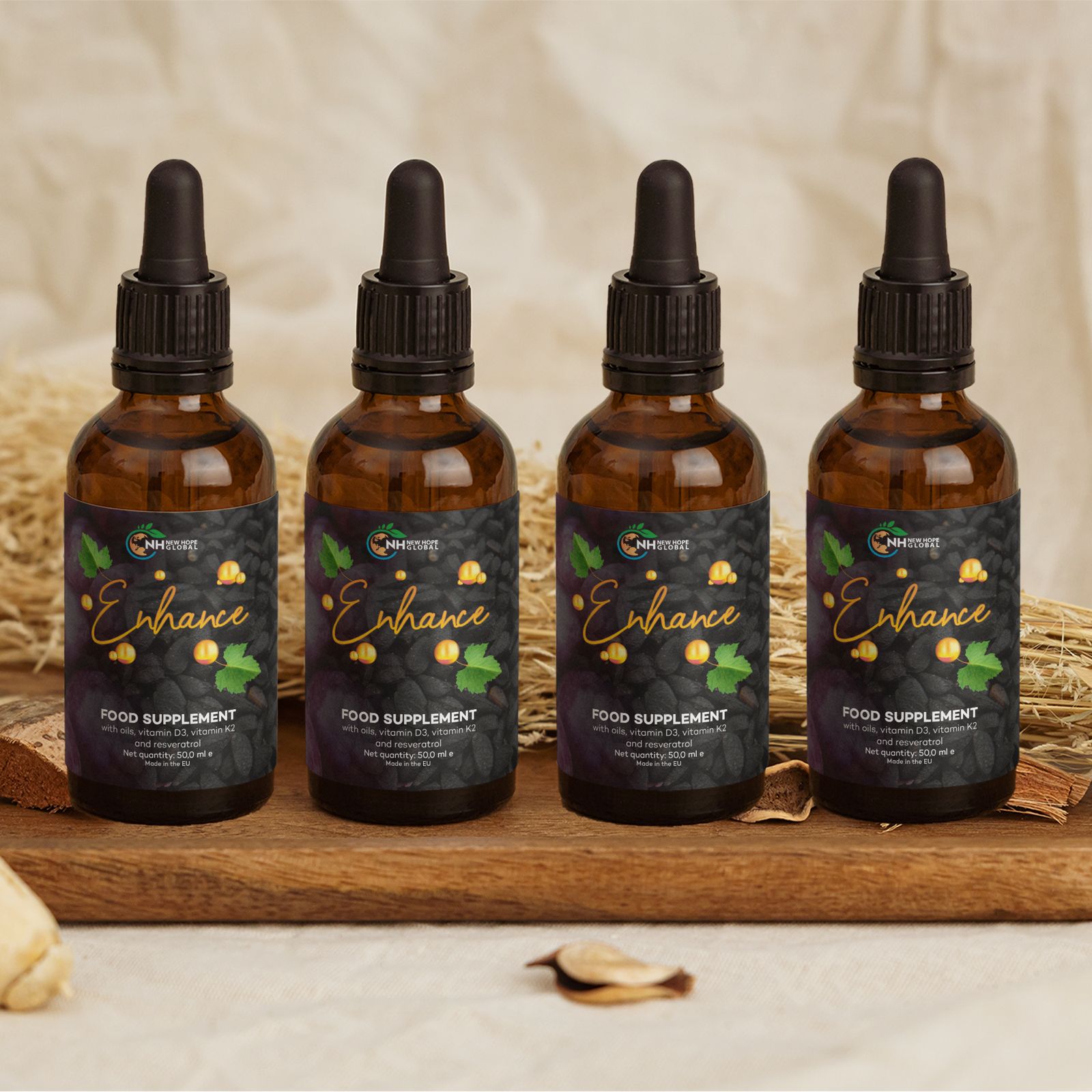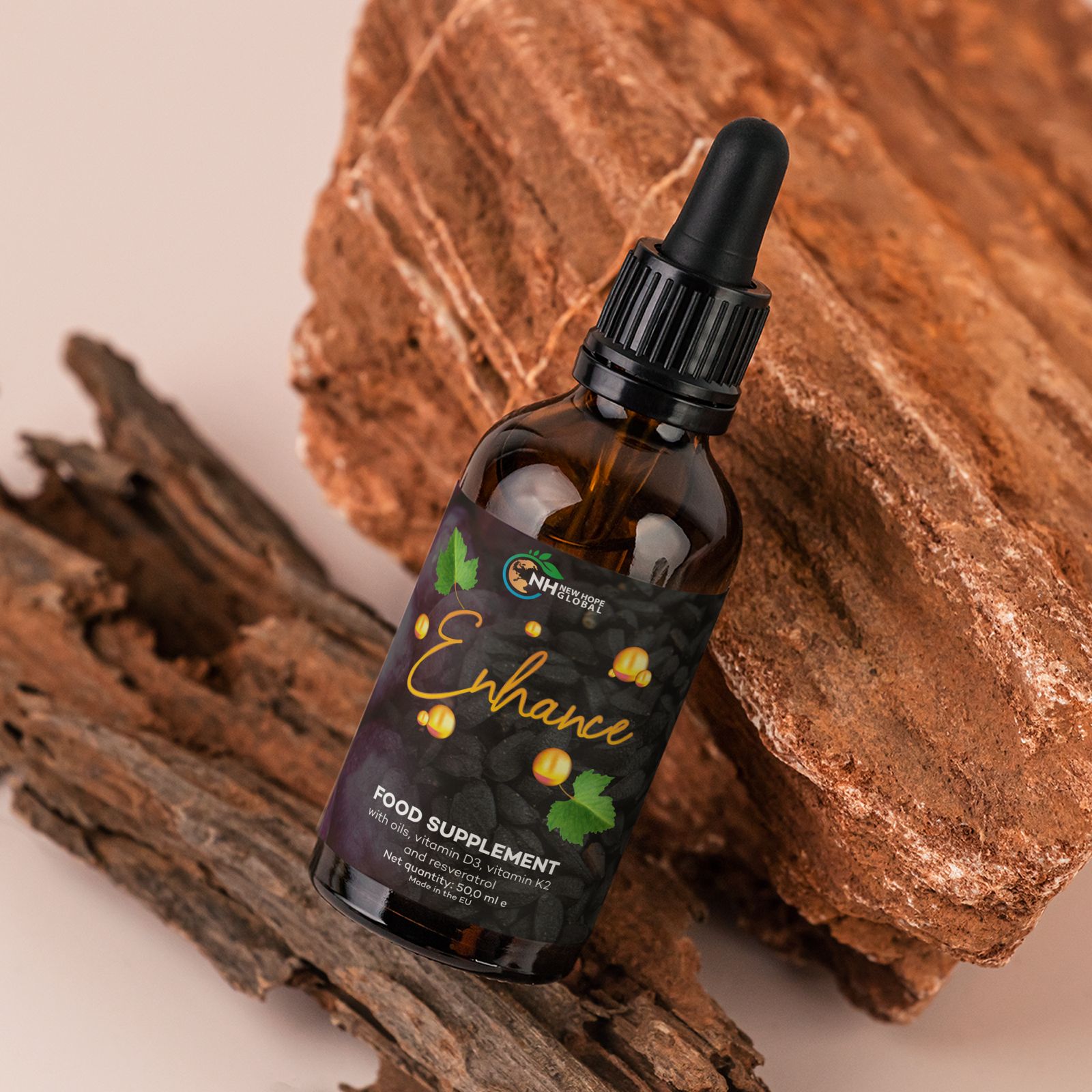 ENHANCE is a meticulously crafted blend of Cold-pressed Organic Black Cumin Seed oil, Grape Seed extract, Resveratrol, Vitamin D3, Vitamin K2, and Avocado oil. These ingredients synergize to provide your body with essential nutrients and antioxidants, supporting overall health.